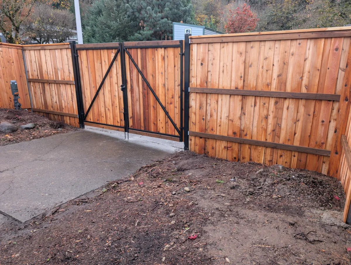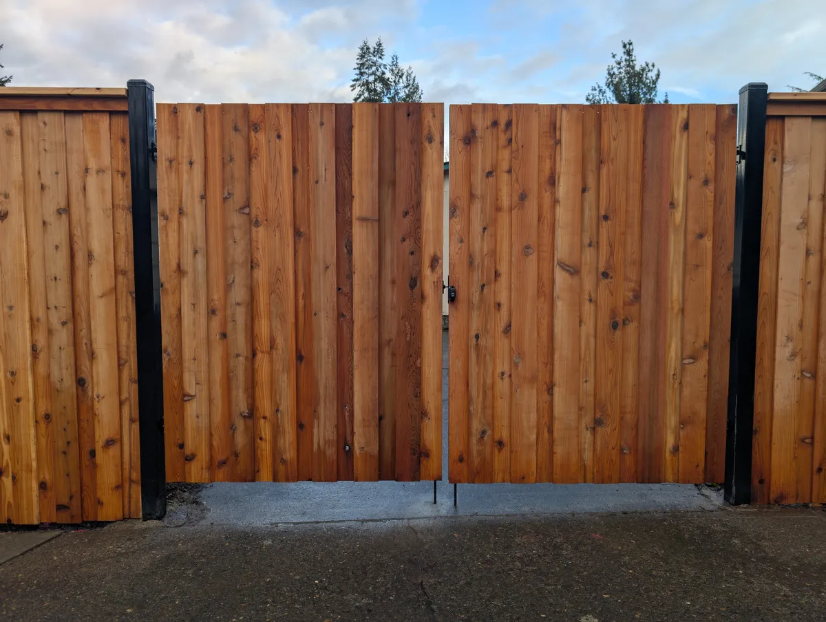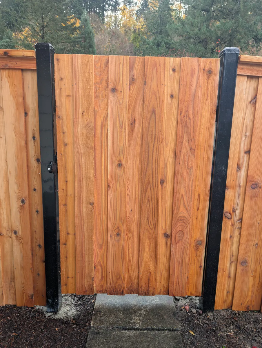 Attention to hardware and joinery elevates this fence from standard to standout. Stainless steel fasteners were used throughout to prevent rust and staining, ensuring long-term durability and a clean finish. Sleek black powder-coated steel gate posts punctuate key access points, offering both a modern visual contrast and critical structural reinforcement. The custom-fabricated gate frames, fully welded for strength, are equipped with self-closing hinges and keyed latches—adding a layer of security and day-to-day convenience for the homeowners, guests, and service providers alike.