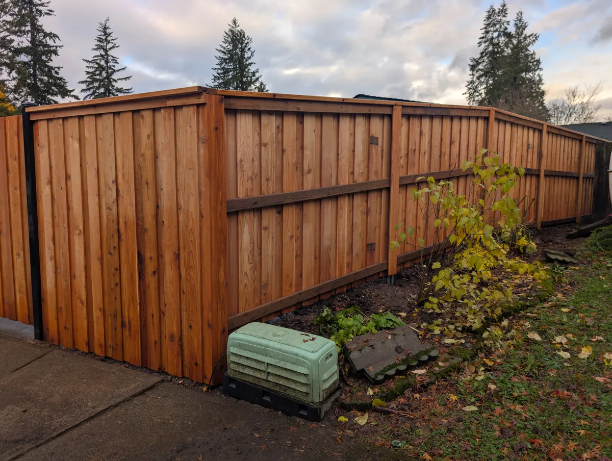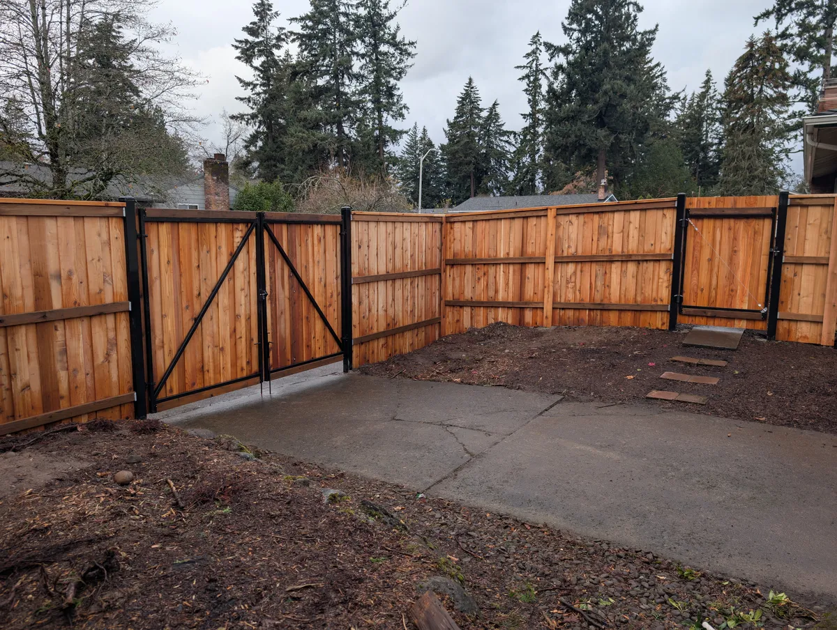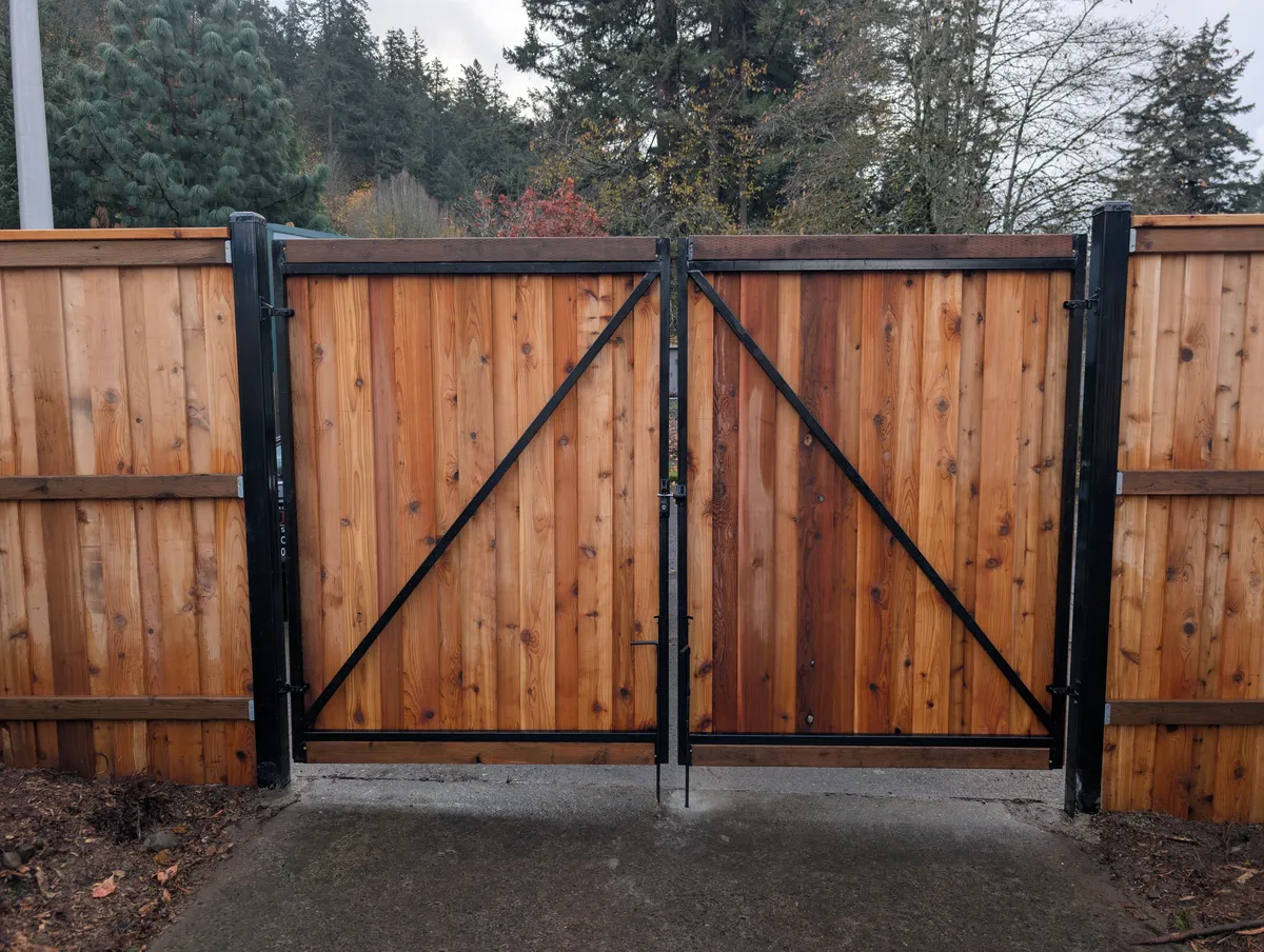 Attention to hardware and joinery elevates this fence from standard to standout. Stainless steel fasteners were used throughout to prevent rust and staining, ensuring long-term durability and a clean finish. Sleek black powder-coated steel gate posts punctuate key access points, offering both a modern visual contrast and critical structural reinforcement. The custom-fabricated gate frames, fully welded for strength, are equipped with self-closing hinges and keyed latches—adding a layer of security and day-to-day convenience for the homeowners, guests, and service providers alike.