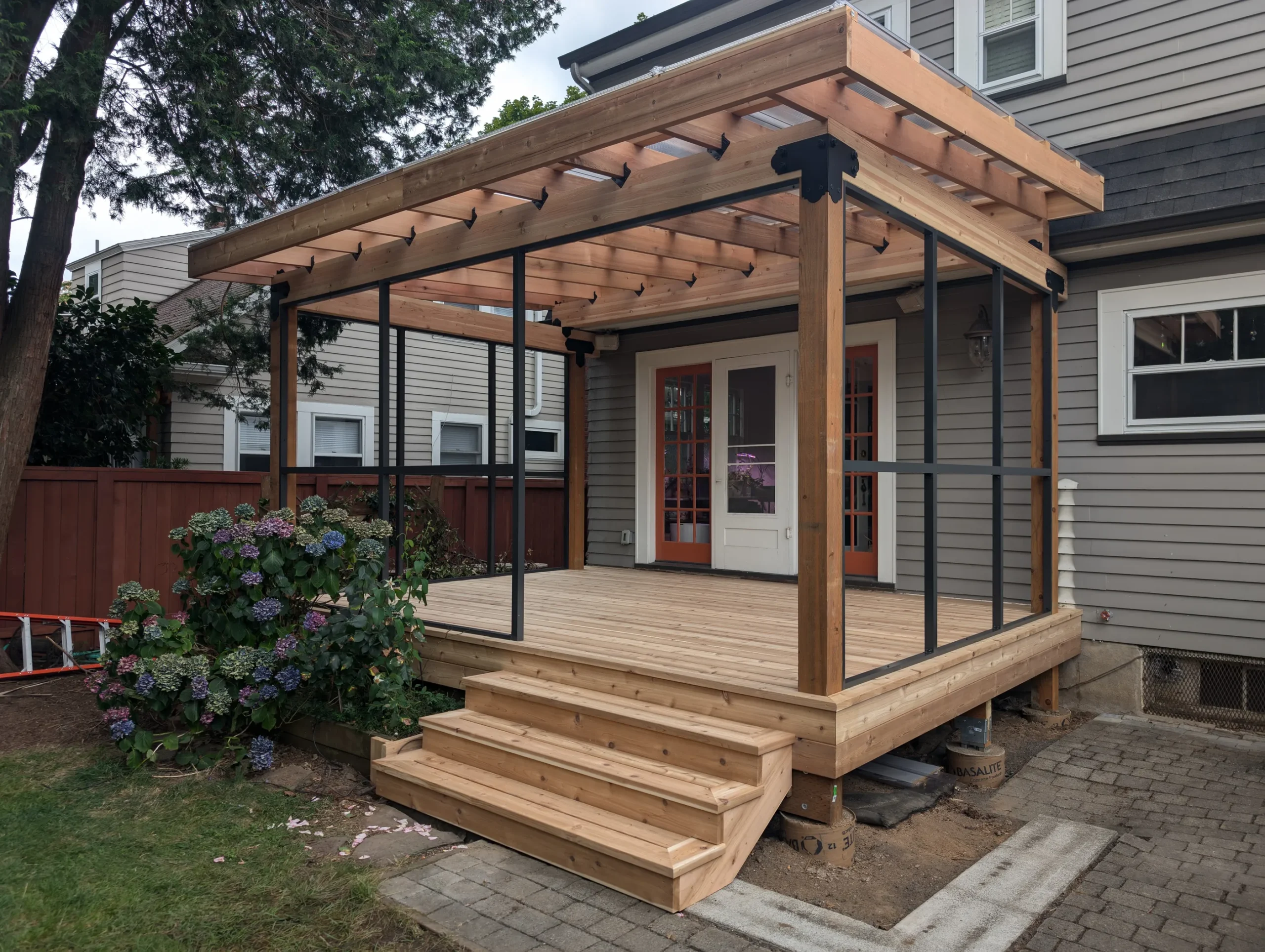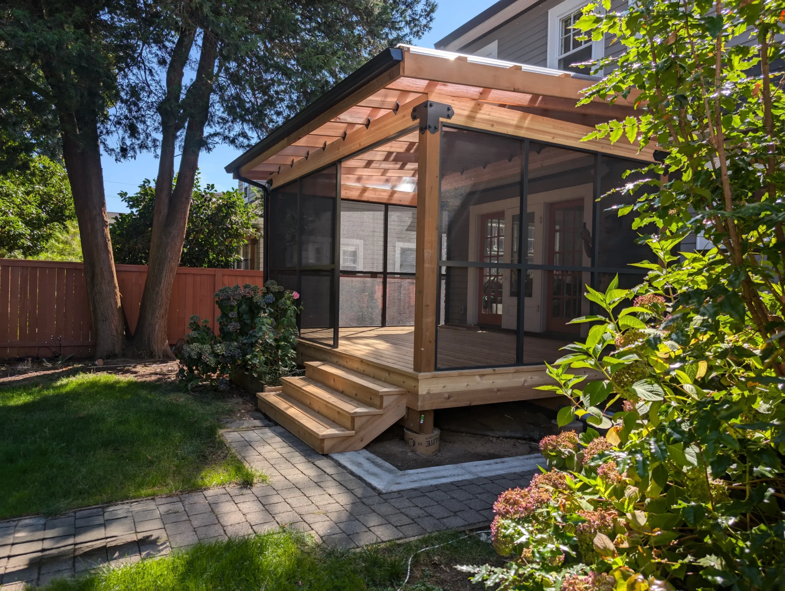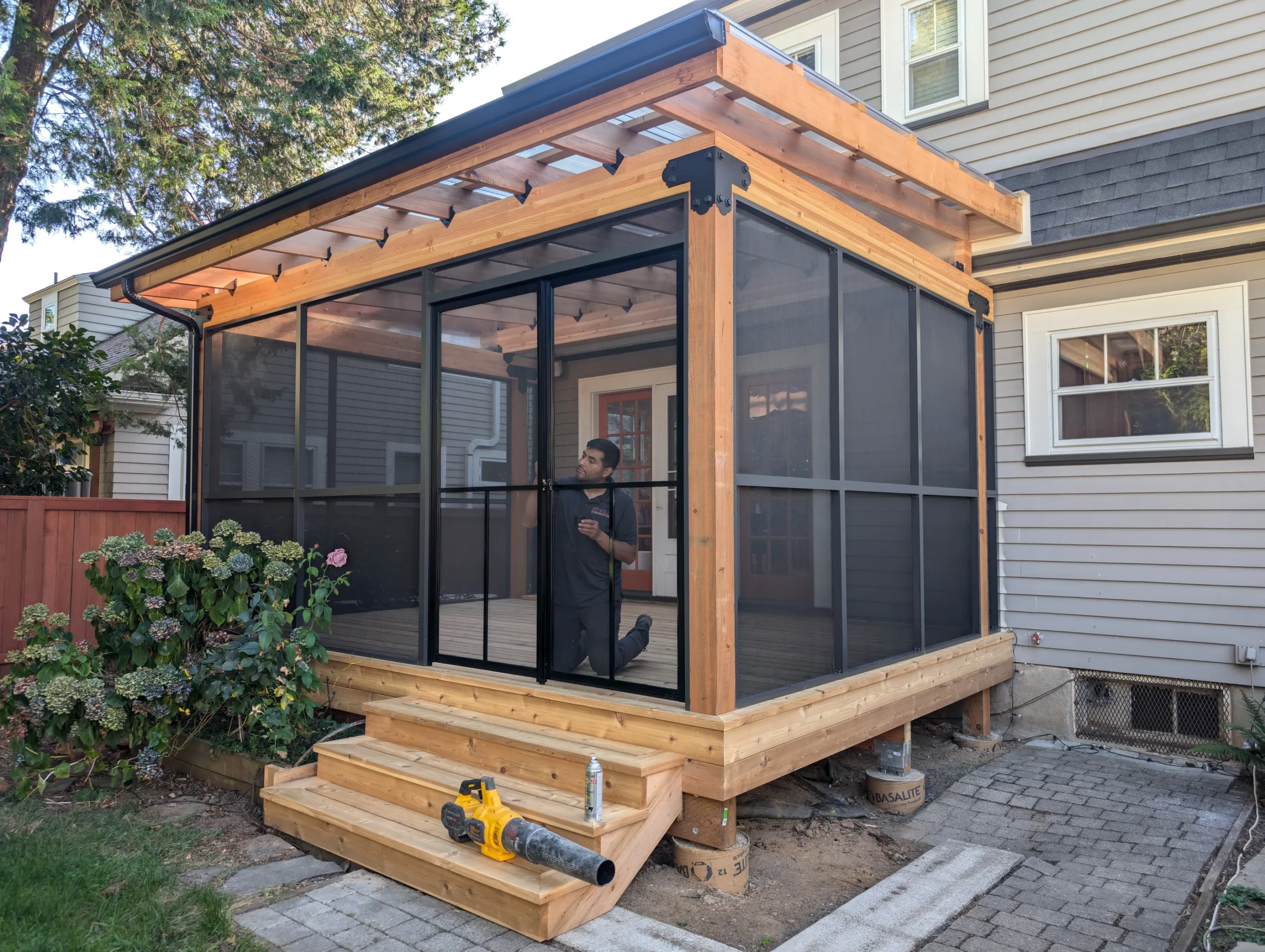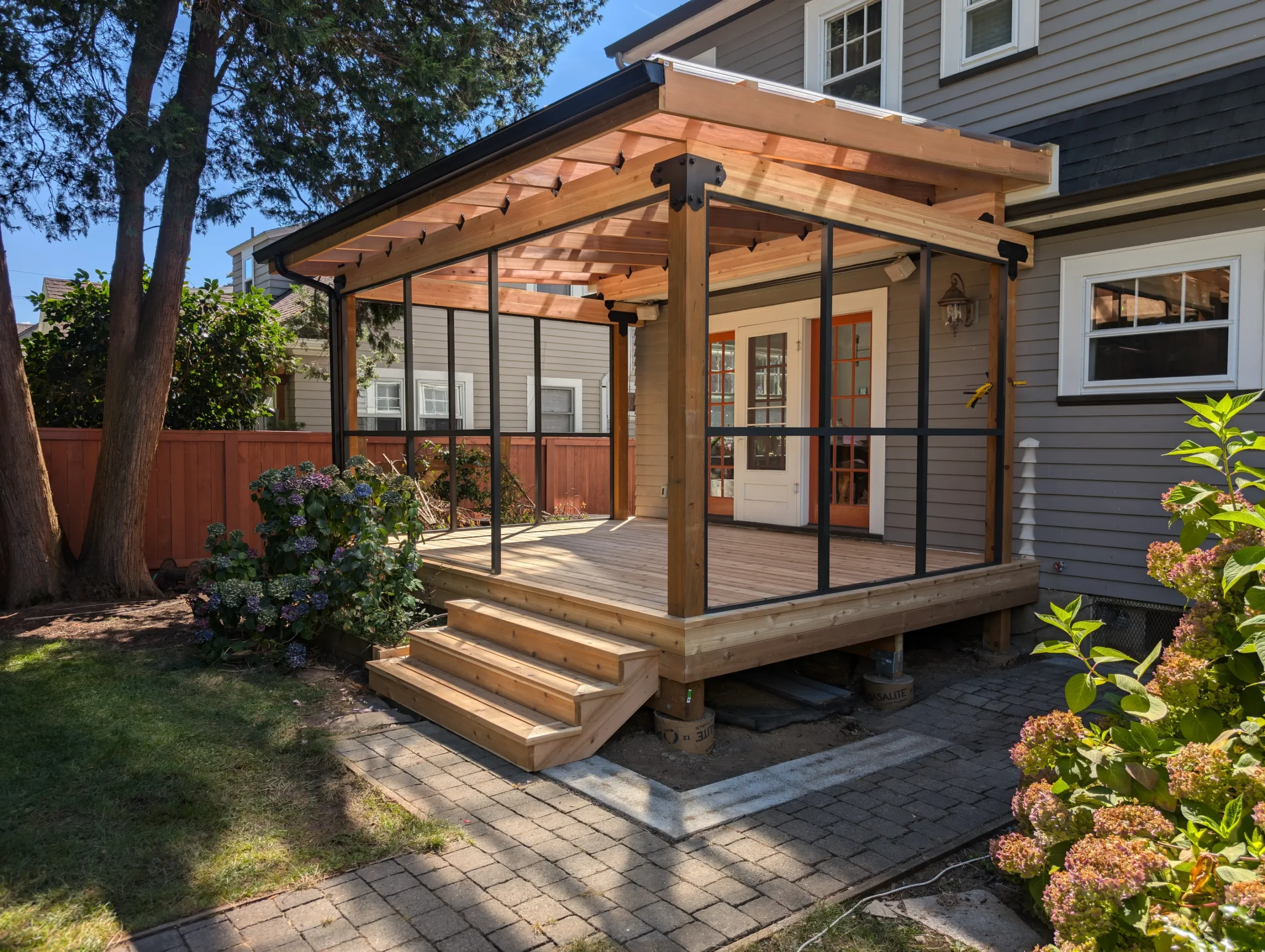 This custom-built enclosed patio was thoughtfully designed to provide a safe, enriching outdoor experience for both the homeowners and their feline companions. Nicknamed “The Ultimate Cat Patio” by its happy owner, the space blends the comfort of a well-constructed cedar deck with the security of a full enclosure – allowing pets to enjoy the sights, sounds, and fresh air of the outdoors without risk.