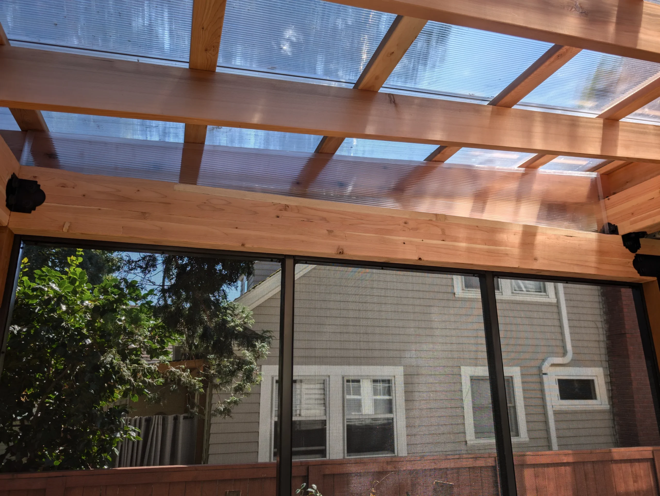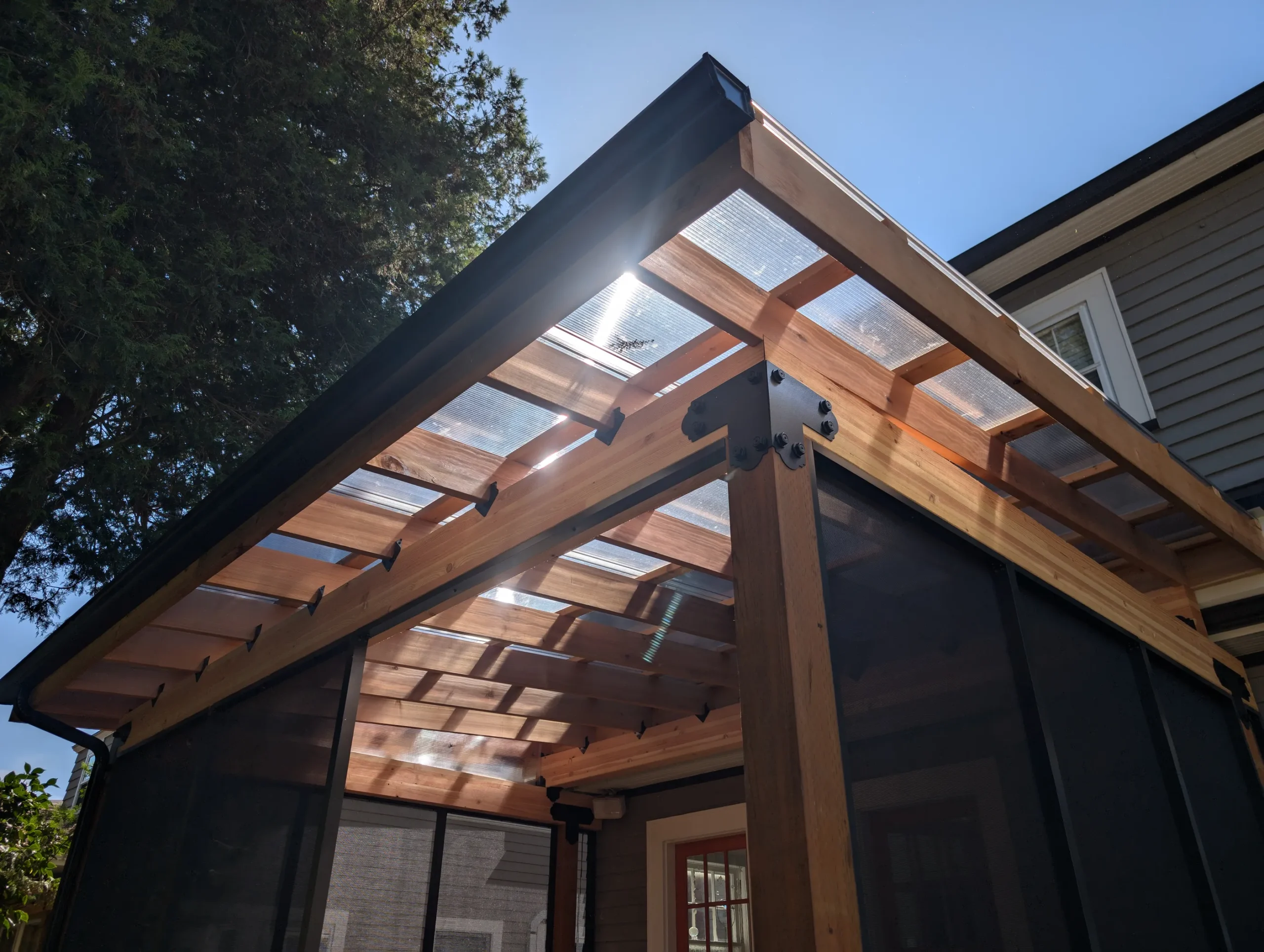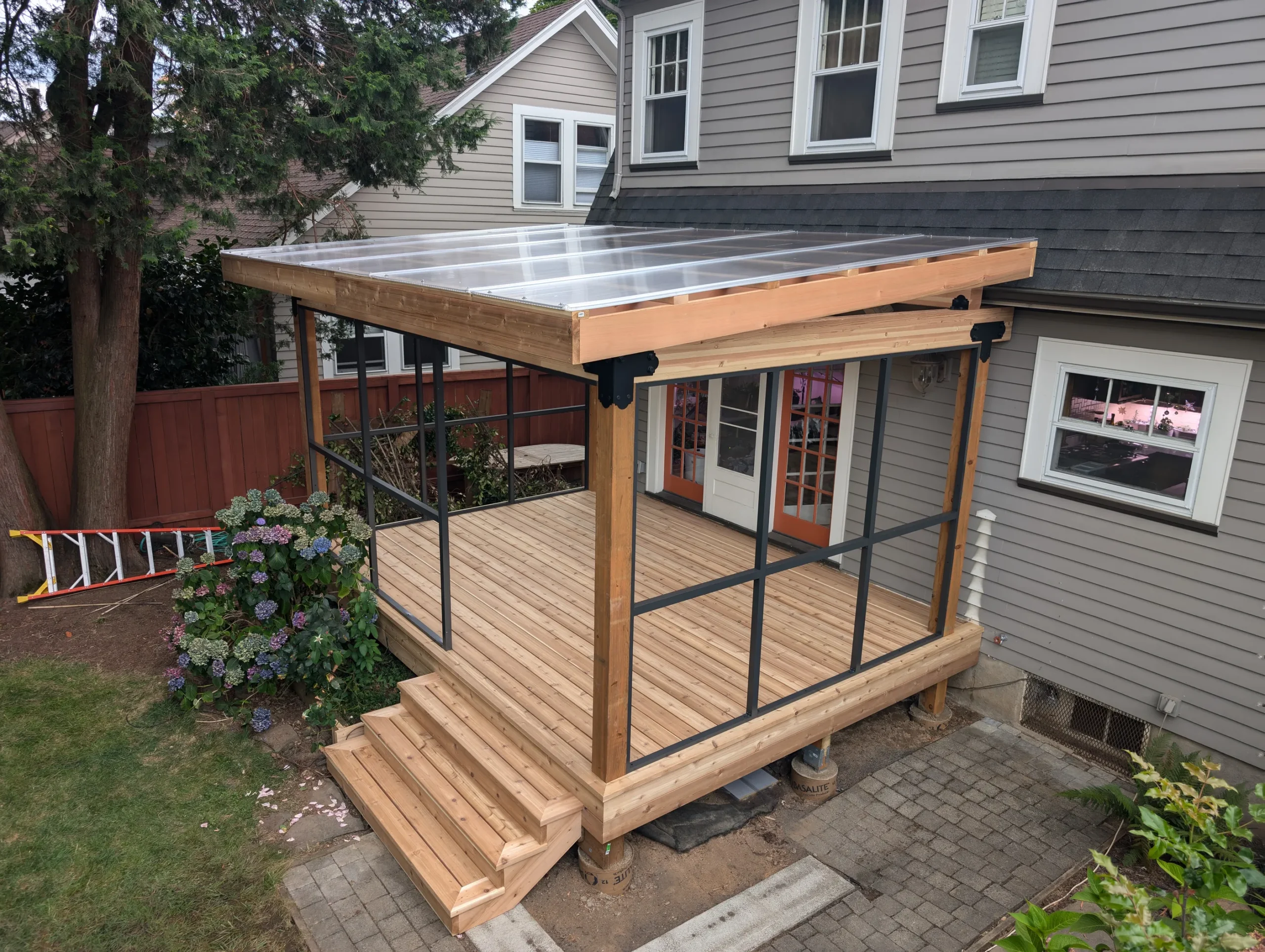 The structure features pressure-treated framing and robust 6×6 posts, anchored with Simpson Strong-Tie brackets for maximum stability. Durable mesh screening wraps the entire space, offering visibility and ventilation while keeping pests out and curious cats safely in. A clear polycarbonate roof shelters the area from rain and debris while letting in ample natural light, ensuring the space feels open and inviting year-round.